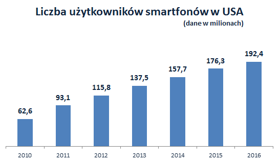 Optymizm analityków wynika w dużej mierze z prognoz dla światowego rynku smartfonów, który w najbliższych latach ma ogromny potencjał do wzrostu, wynika z najnowszego badania serwisu eMarketer.com. Szacunki analityków zakładają, że liczba urządzeń na amerykańskim rynku od 2011 do 2016 roku podwoi się - z 93,1 do 192,4 miliona. Jeszcze w tym roku, więcej niż co drugi telefon komórkowy w kieszeni Amerykanina będzie smartfonem.