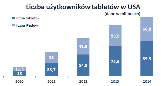 Znacznie szybciej w najbliższych latach będzie się rozwijał rynek tabletów. Tylko w minionym wzrost wyniósł ponad 62 procent. Z szacunków eMarketer.com wynika, że do końca tego roku ich liczba w USA wzrośnie o 38 procent do poziomu 75,6 milionów sztuk. Spory w tym udział będzie miał iPad. W 2012 cztery na pięć tabletów w USA wyprodukował Apple. Popularność tego urządzenia od 2011 do 2014 roku podwoi się, z 28 do 60,8 milionów sztuk.