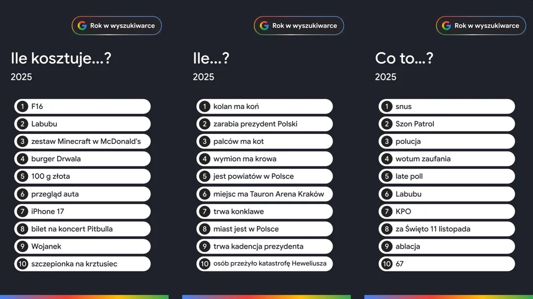 Starsze pokolenia prawdopodobnie próbowały zrozumieć język młodszych lub nieznane im trendy wpisując: co to snus, Szon Patrol, Labubu, nepodziecko, sybau czy gaslighting. Wyszukiwarka pełniła też rolę encyklopedii dziwnych faktów. Pytano o anatomię zwierząt: gdzie pasikonik ma uszy, ile kolan ma koń, czy zaskroniec mruga, ile wymion ma krowa. W kategorii „Przepisów” królowała dubajska czekolada. Ponieważ wymaga ona specyficznych składników, Polacy pytali gdzie kupić ciasto kataifi oraz gdzie kupić ciasto filo. To przykład, jak jeden viralowy przepis generuje ruch w zupełnie innych kategoriach wyszukiwania.